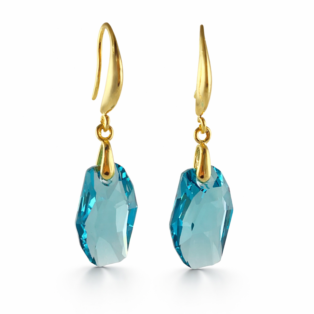 Brincos banhados a ouro com cristal austríaco na cor turquesa, lapidado para revelar profundidade, brilho e variações sutis de luz.