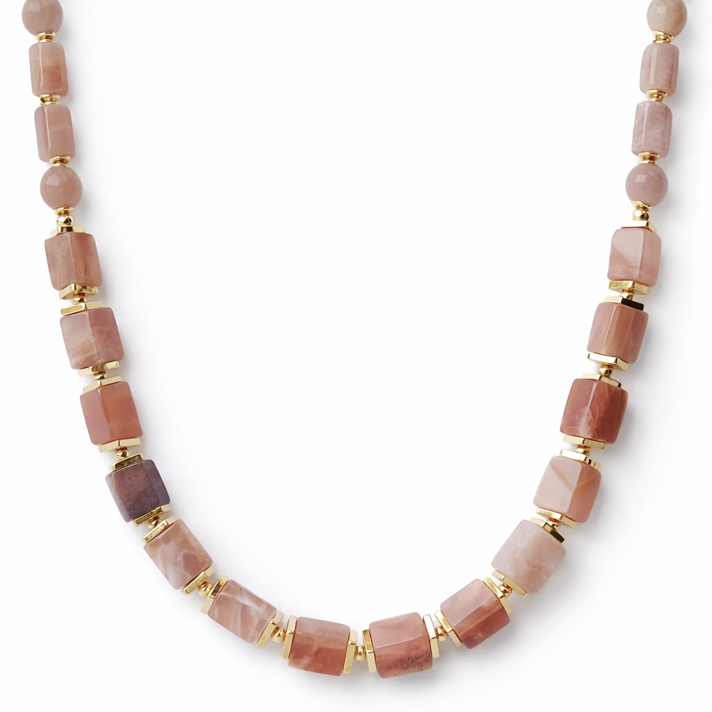 As pedras da lua rosadas, com seus tons quentes e naturais, criam um ritmo visual harmonioso ao redor do colo, enquanto os detalhes dourados realçam a composição com brilho discreto e sofisticado. O fecho em estilo T acrescenta um toque contemporâneo e charmoso, valorizando inclusive o uso aparente nas costas.