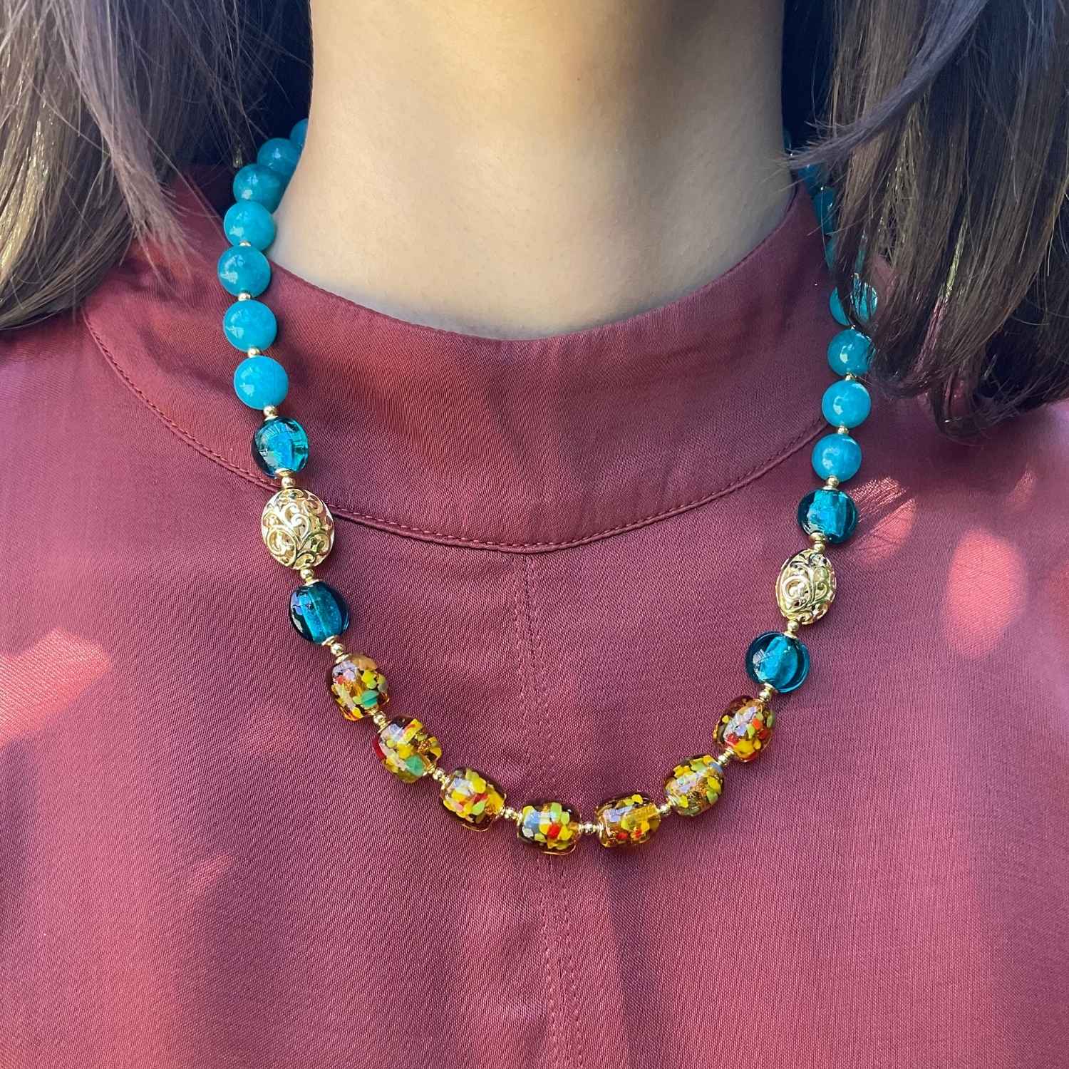 Inspirado nas areias douradas do oásis de Bahariya, este colar une a serenidade azul-esverdeada da amazonita ao charme artístico do Murano caramelo.