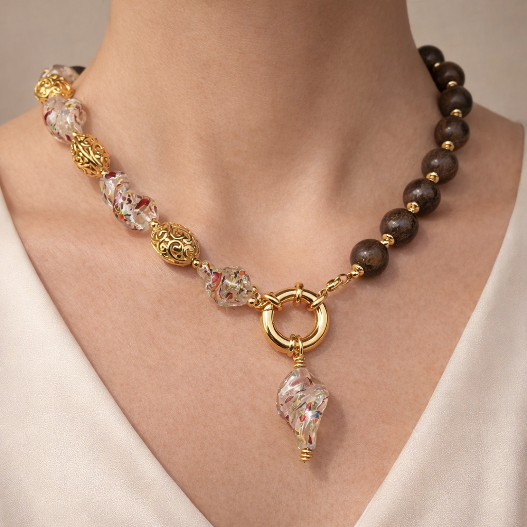 Inspirado nas dunas de Siuá, este colar contrasta a profundidade terrosa da bronzita — com reflexos bronze — com o brilho cintilante do Murano aventurina, realçados pelo dourado.
