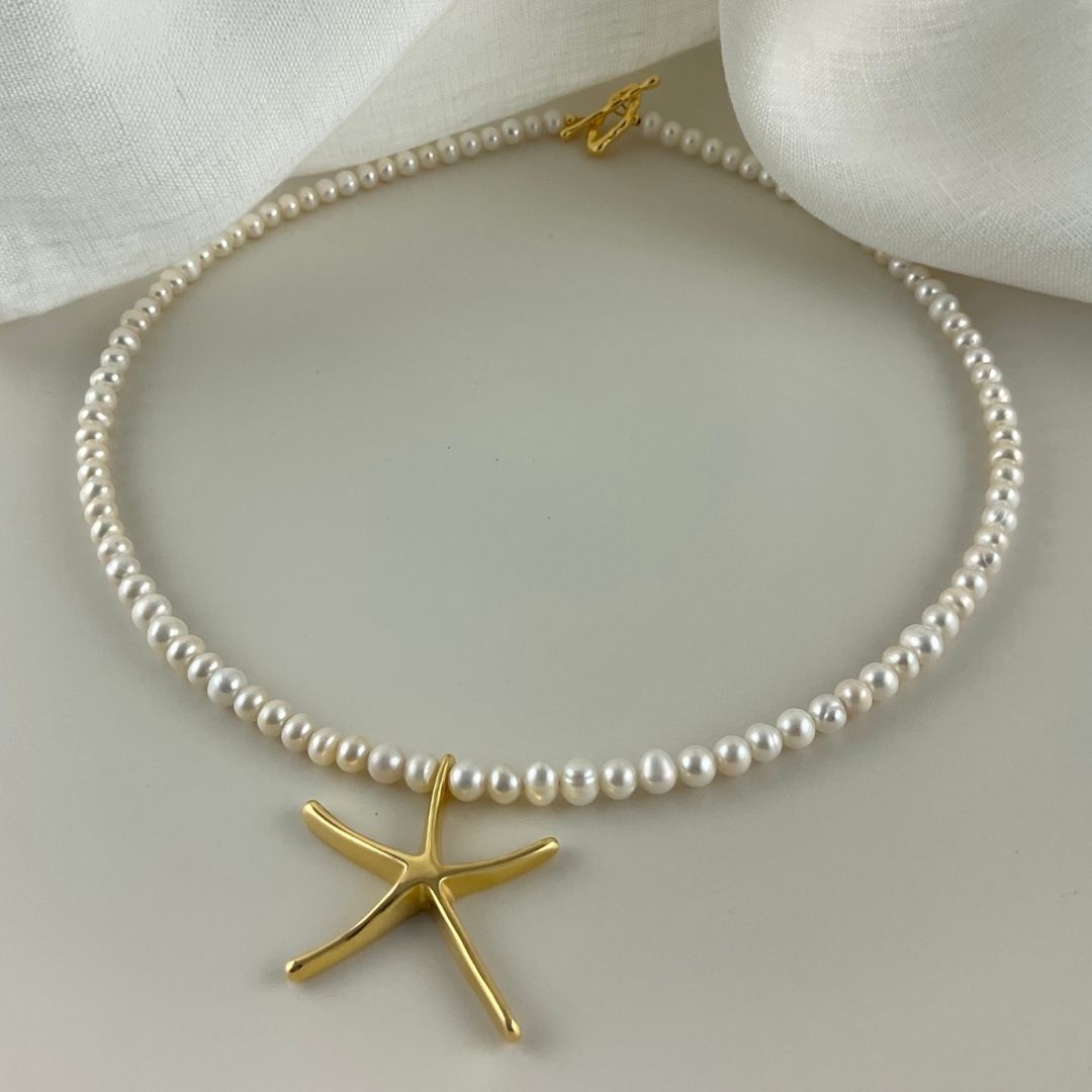 Um colar delicado e atemporal que combina o brilho natural das pérolas barrocas com o charme do pingente de estrela-do-mar. Uma peça inspirada na serenidade da costa italiana, perfeita para iluminar produções do dia a dia com elegância.