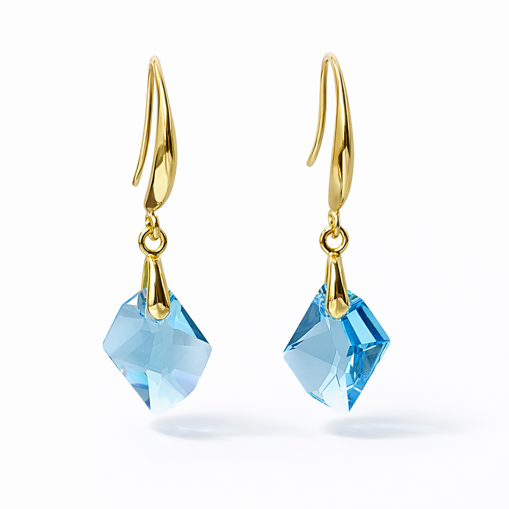 Confeccionados com cristal austríaco na tonalidade aquamarine, o azul claro e luminoso evoca frescor, leveza e a transparência das águas cristalinas, refletindo a luz de forma refinada e delicada.