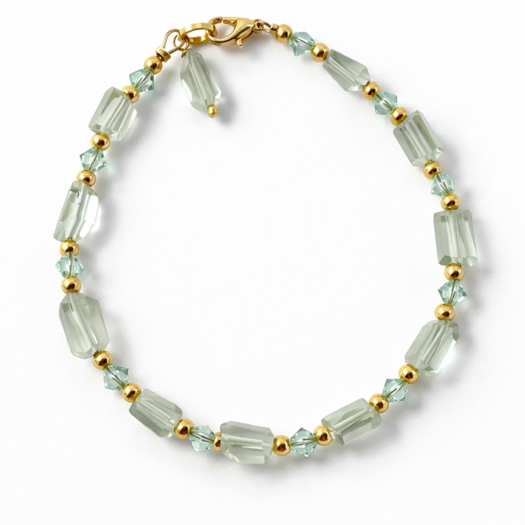 Pulseira artesanal composta por prazialita natural (com variações entre 4 mm e 10 mm) e cristais austríacos de 4 mm. Seus tons verde-claros e translúcidos evocam as águas calmas da enseada de Laurito — luminosas, refrescantes e de beleza delicada.