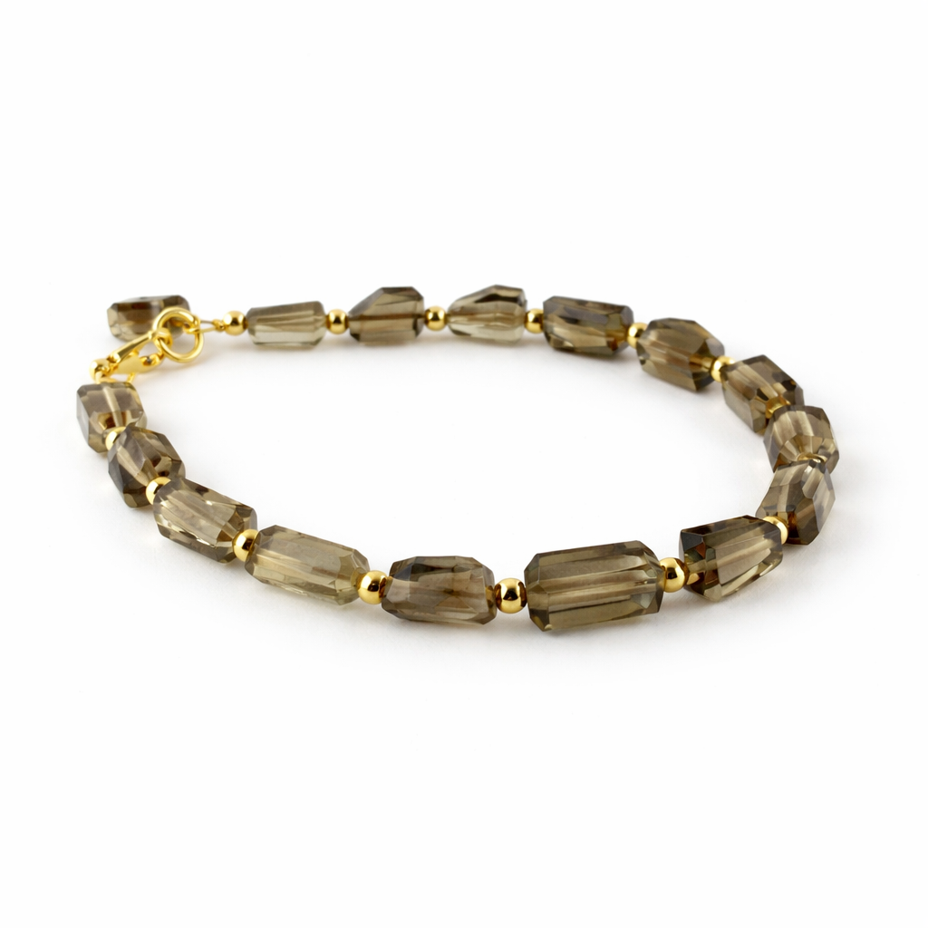 Finalizada com acabamento banhado a ouro, a peça combina a profundidade do quartzo fumê com o calor do metal dourado, resultando em uma pulseira clássica e atemporal.