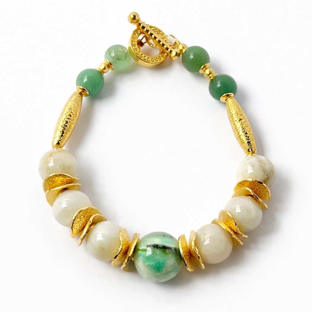 Pulseira banhada a ouro 18k com pedras de jade natural nos tamanhos 10 mm e 7 mm.
