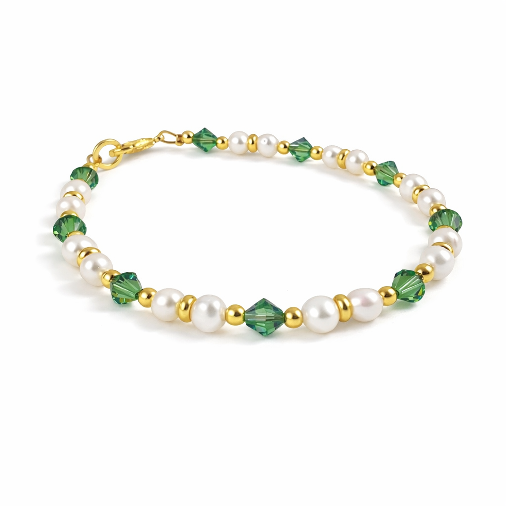 As pérolas barrocas revelam a sofisticação clássica, enquanto os cristais austríacos em tonalidade verde acrescentam um toque de leveza e naturalidade ao conjunto. O acabamento banhado a ouro 18k valoriza a peça com brilho e elegância atemporal.